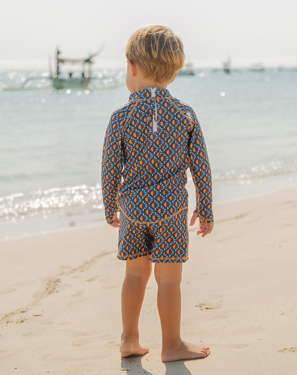 Suntopia Shorties in emerald green provide all day 50+ sun protection. The fun never ends in the warm magical land of Suntopia. This modern geo print represents a warm sunny utopia.  Unisex Euro Swimming Trunk for ages 1-6 years. Get beachy in our super cute unisex Suntopia Zebra Shorties. These sustainable swimming trunks are made from a luxury fabric which consists of recycled plastic and elastane. UPF 50+ sun safe and do not fade or wear from high exposure to chlorine.  Elastic tie waist with drawstring. All exclusive Cosmo Crew prints are designed to stand out from the crowd and celebrate individuality.
